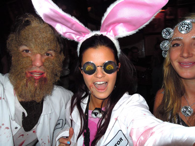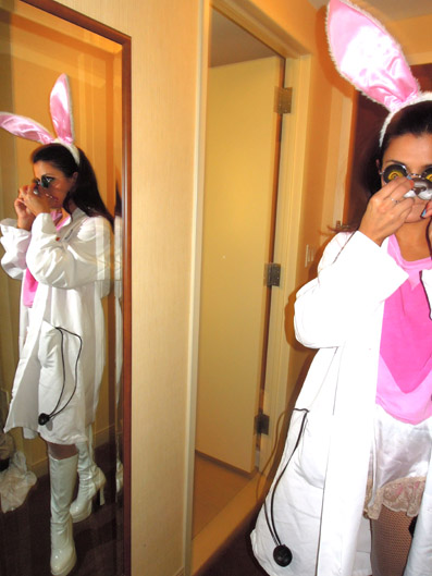 ears,eyes, nose, doctor jacket, white fish net tights from newyorkcostumes.com