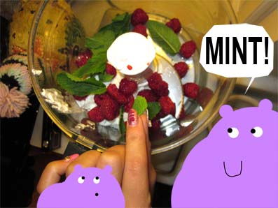 so we 1st made pudding. PINEAPPLE WITH PINK CREAM! we blendid fresh greek yoghurt, mint & darling raspberries.